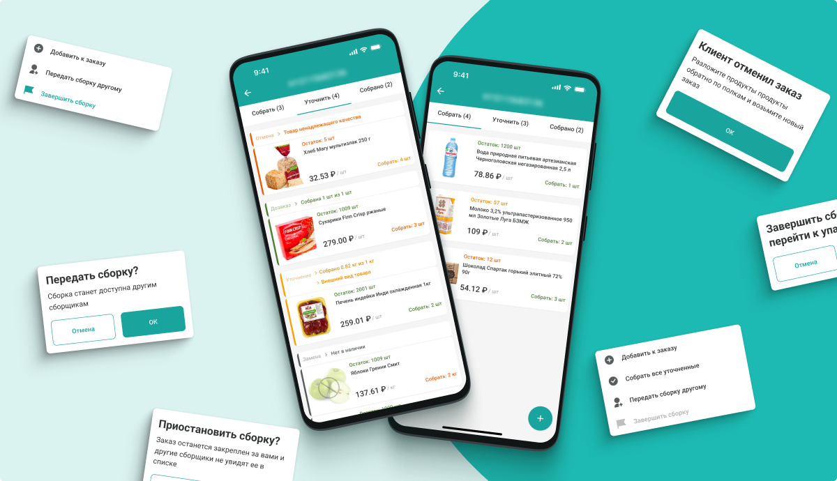 - связь с клиентом для замены или удаления из заказа позиций, которых нет в наличии, или если у сборщика возникли сомнения в качестве товара, упаковки, сроке годности;