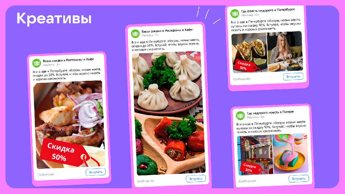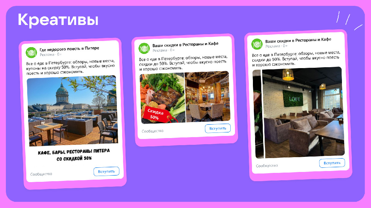 Офферы: в объявлениях использовали короткий текст с формулировками «где недорого поесть в СПб», «бесплатные купоны на скидку 50%».