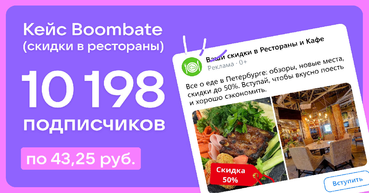Страница кейса/результат: https://blog.xn--90aha1bhc1b.xn--p1ai/kejs-boombate-skidki-v-restorany10198-podpischikov-po-43-rub