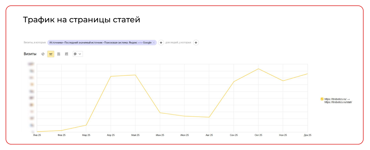 2.3. Контент: анализировали тренды и спрос в отрасли и публиковали по 2–3 материала в месяц о сценариях внедрения, типовых задачах и примерах применения роботизированных решений. Усиливали внутреннюю перелинковку между статьями и коммерческими страницами, улучшая навигацию и распределение веса.