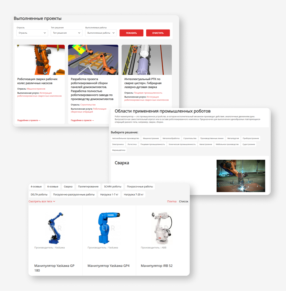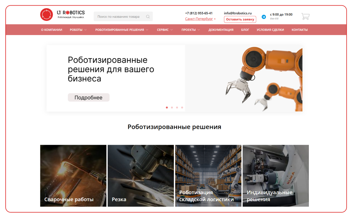 1.1. Мы собрали базовую семантику по ключевым направлениям бизнеса (коммерческие и информационные запросы по промышленной роботизации и автоматизации) и на её основе выстроили структуру сайта: распределили запросы по посадочным страницам и наполнили каталог решений с учетом поискового спроса.