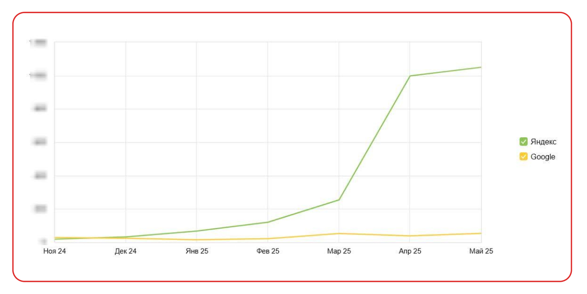 После базовых работ сайт корректно проиндексировался и получил первые показы в Яндексе, начав ранжироваться по низкочастотным запросам. В Google трафик оставался минимальным — типичная «песочница» нового домена без накопленного доверия, ссылочного профиля и поведенческих сигналов, поэтому одной базовой оптимизации для стабильного роста было недостаточно.