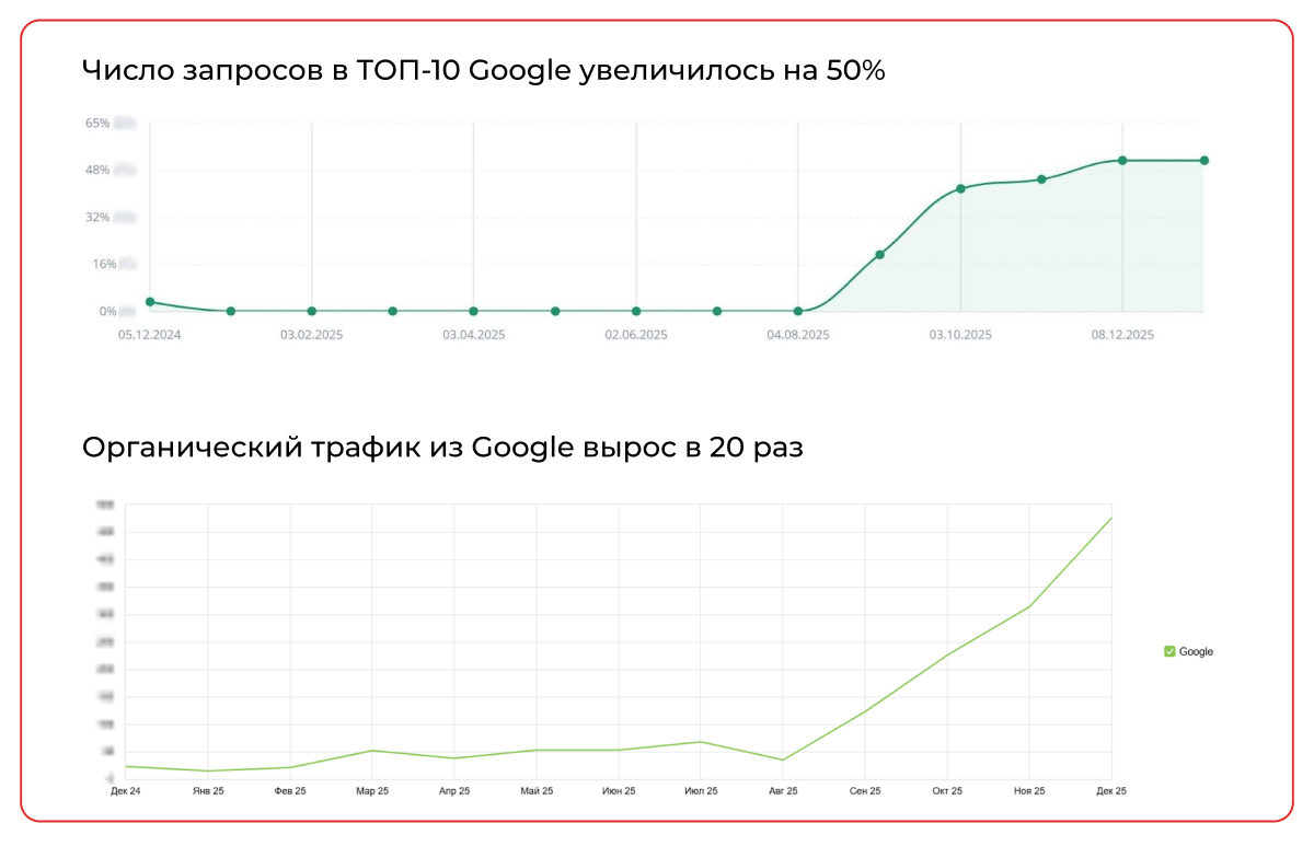Параллельно улучшаем UX — навигацию, фильтры, карточки и структуру страниц, чтобы пользователям было проще находить нужные решения. Это обеспечивает стабильный рост органического трафика и повышает конверсию в обращения.