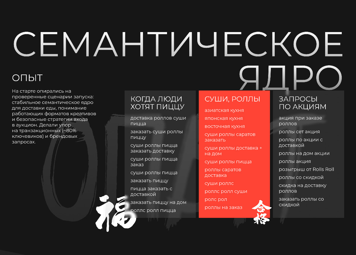 Опыт. На старте опирались на проверенные сценарии запуска: стабильное семантическое ядро для доставки еды, понимание работающих форматов креативов и безопасные стратегии входа в аукцион. Делали упор на транзакционных (~80% ключевиков) и брендовых запросах.