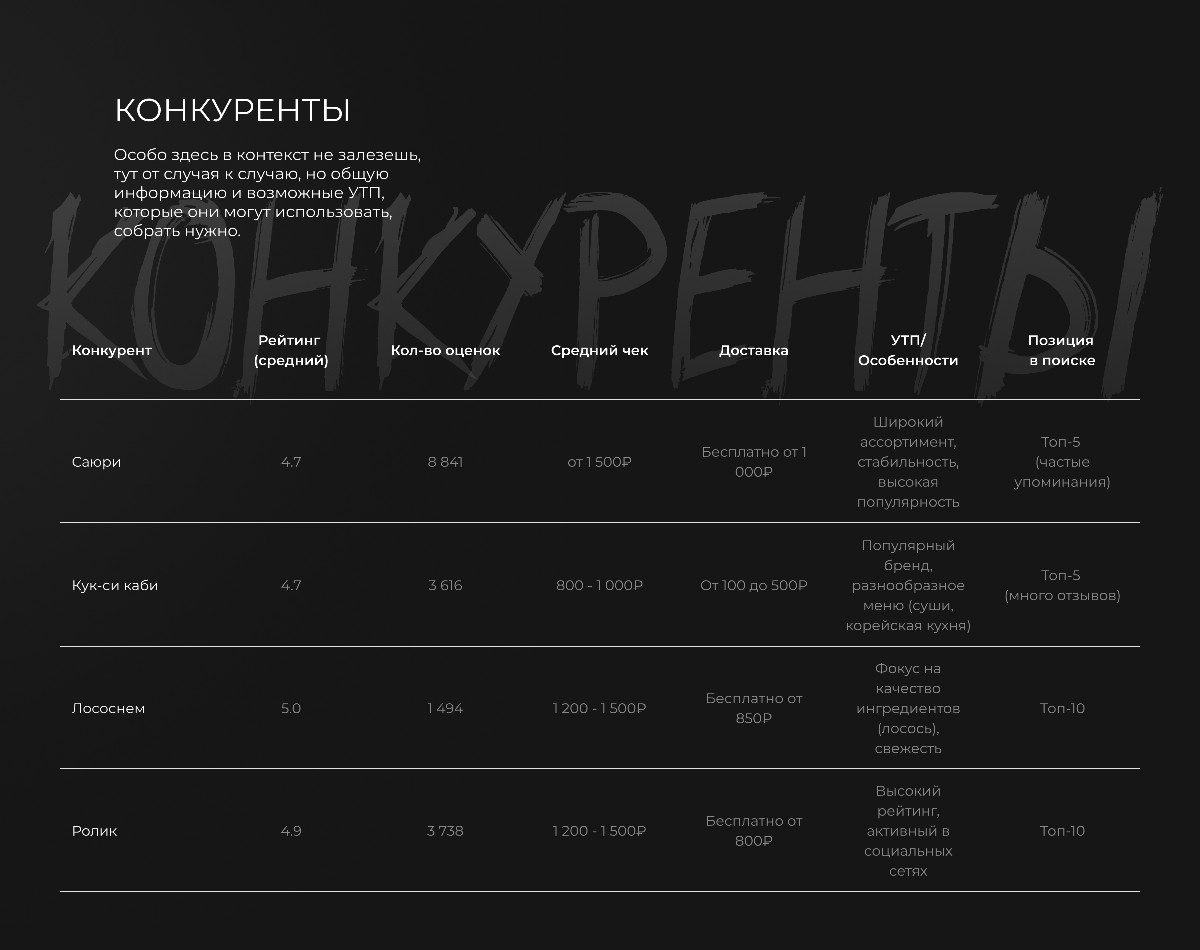 - Маркетинговый анализ: аудит ниши, продукта, позиционирования клиента и активности конкурентов.