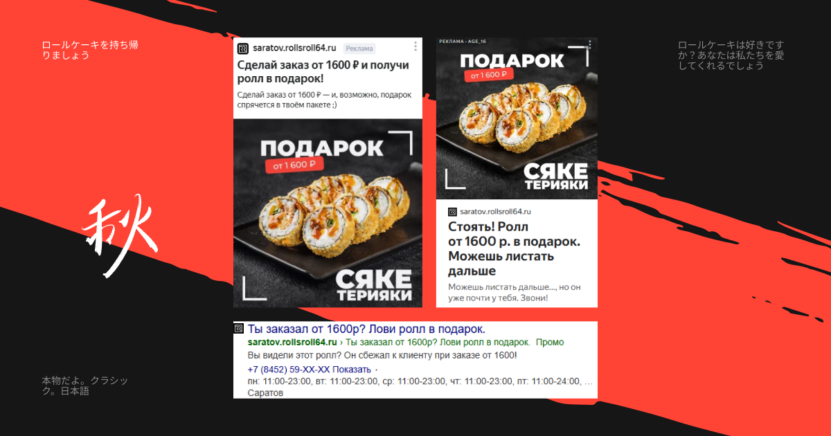 Товары. Здесь клиент упростил нам задачу: качество продукта на фото полностью соответствовало реальности. Нам предоставили профессиональную фотосъемку роллов, пиццы и суши. Это критично для доставки еды: когда картинка в объявлении совпадает с тем, что приезжает курьером, конверсия растёт, а отток клиентов после первого заказа минимален.