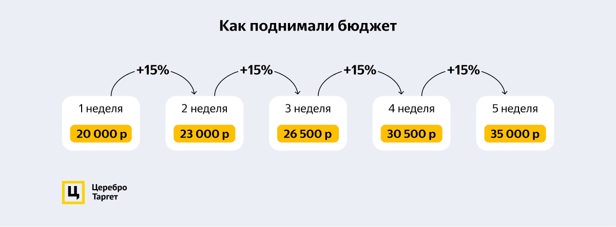Клиент поднял бюджет в кабинете до 200 000 руб. Увеличивать его в кампании начали постепенно, чтобы не сбить обучение рекламной кампании.