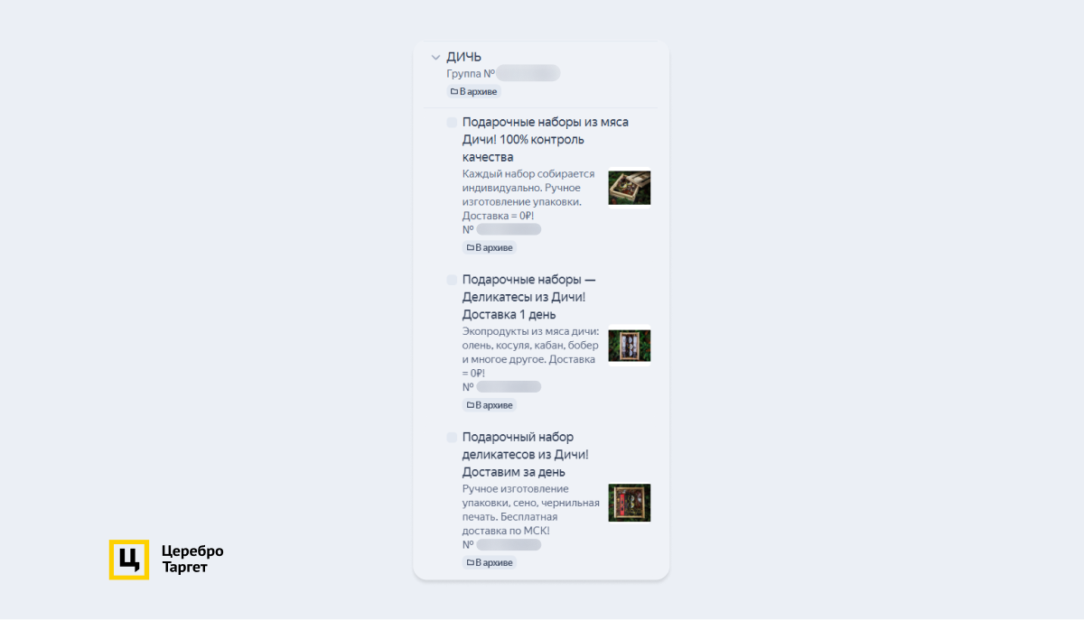 из кабинета: «Подарочный набор деликатесов из мяса Дичи! Доставим за день». Настройки таргетинга ничем не отличались от остальных ЕПК.