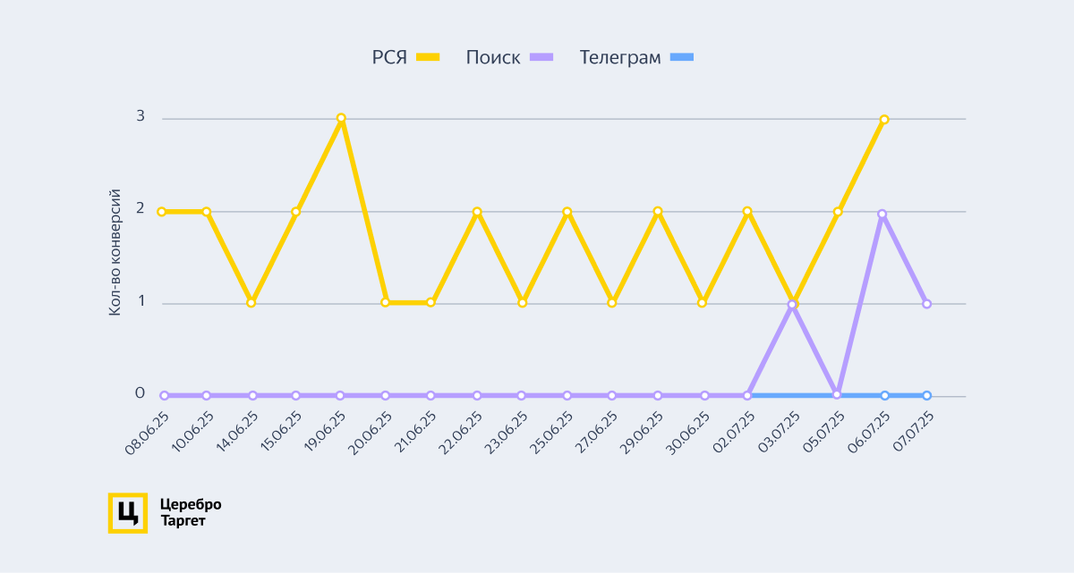 Сначала мы запустили рекламу в РСЯ и в телеграм-каналах. Спустя 3 недели — на Поиске.