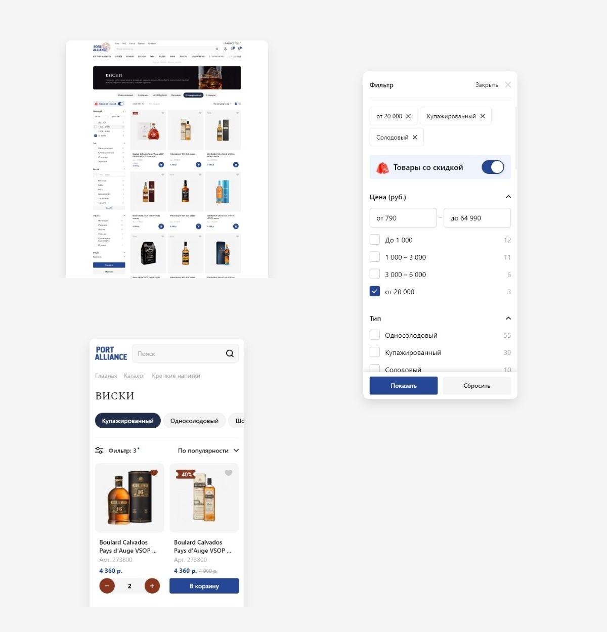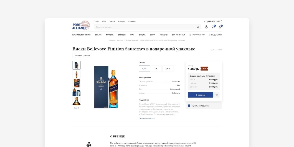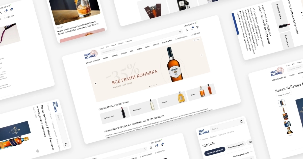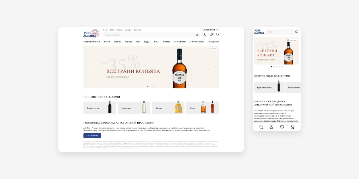 «Порт-Альянс» — это магазин беспошлинной торговли и старейший duty free в России, предлагающий широкий выбор алкогольной продукции, парфюмерии и косметики. Ключевая особенность магазина, это скидки за объем и широкая программа лояльности. Возможность предложить лучшую цену является сильным конкурентным преимуществом, и дает возможность покупателям значительно сэкономить при покупке товара. Все это нужно было учесть при проектировании интерфейса и разработать понятный инструмент для выгодных покупок.