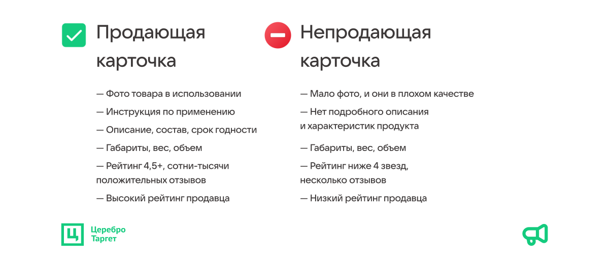 Можно написать конвертящие статьи, получить много трафика на карточку, но упустить продажи, и причина будет не в рекламных кампаниях. На готовность ЦА покупать товар влияет механика самого маркетплейса.