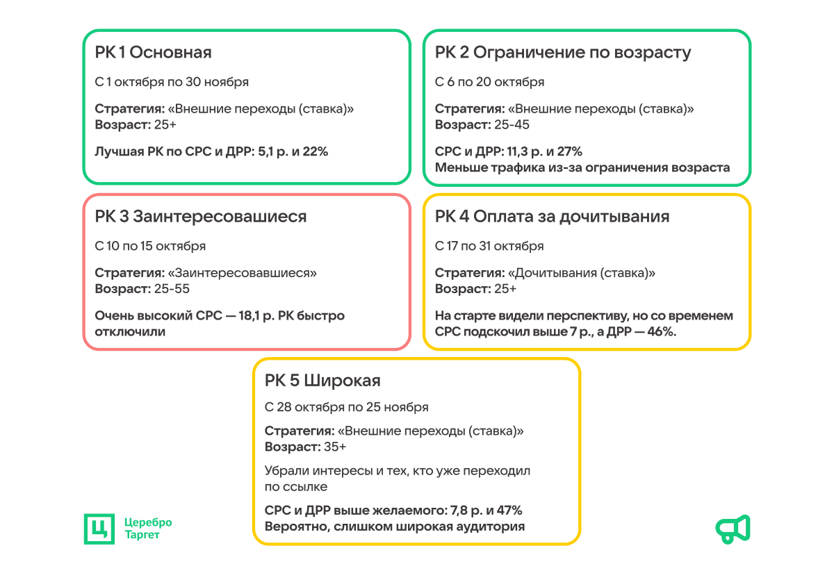 - Выполнили KPI по цене перехода и ДРР.